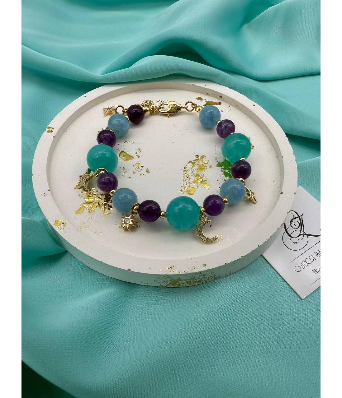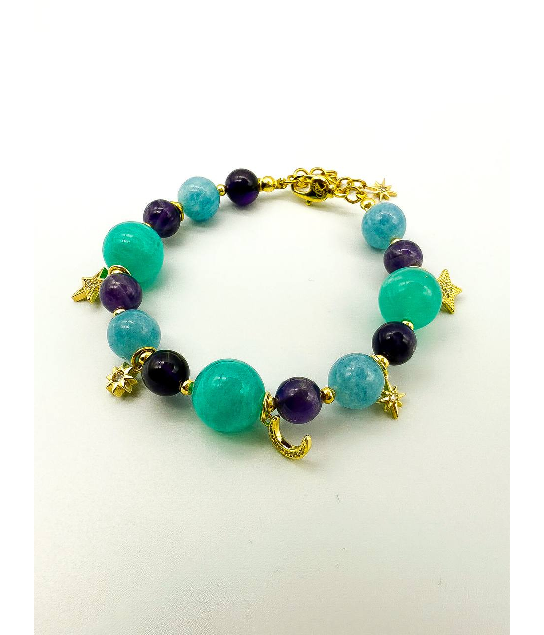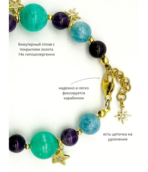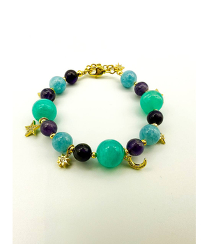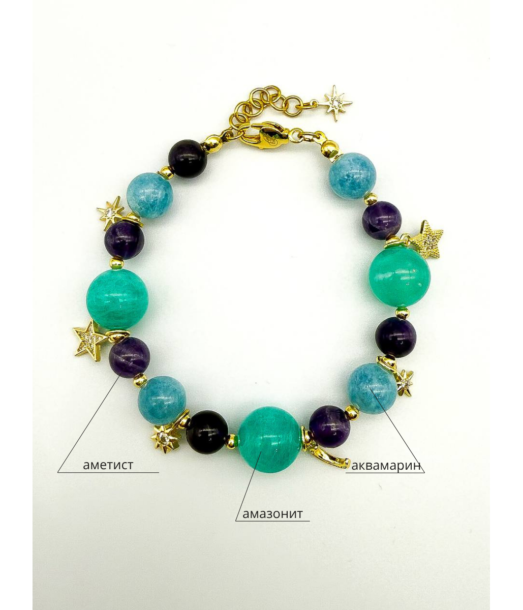 Легкий, как сон, и волшебный, как ночь. Этот браслет соединяет в себе спокойствие аквамарина, глубину аметиста и яркость амазонита. Золотистые подвески — звёзды и полумесяц — мерцают при каждом движении, словно маленькие огоньки во тьме.