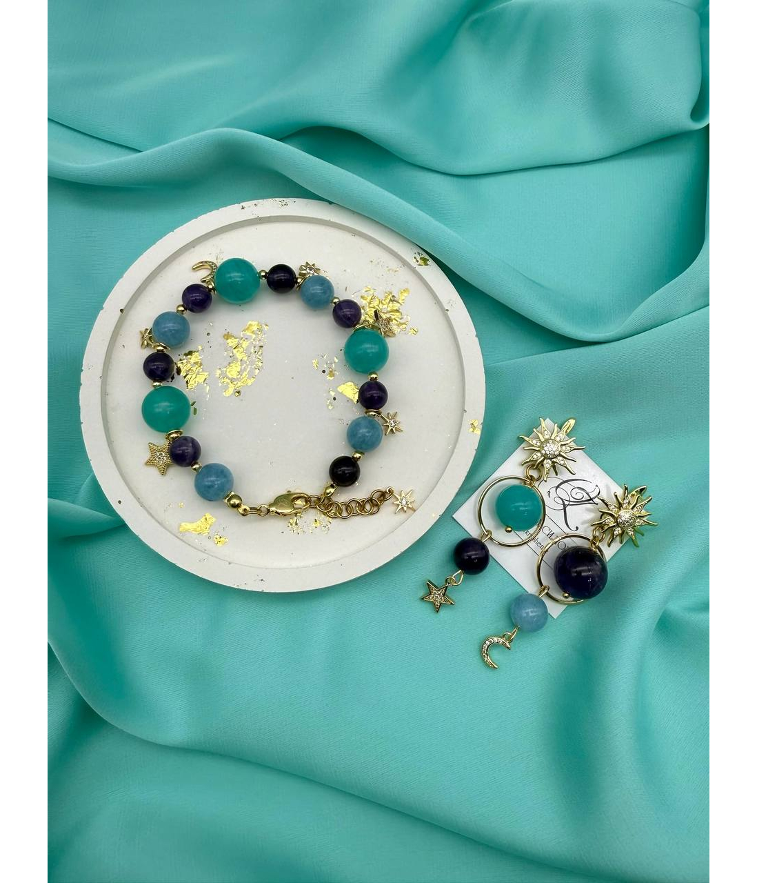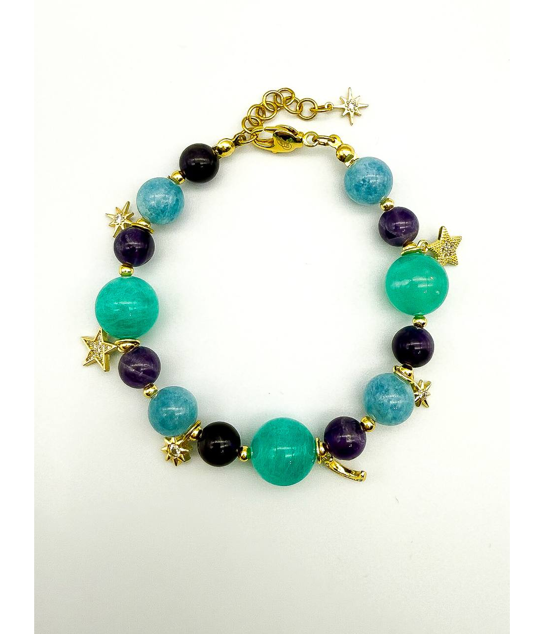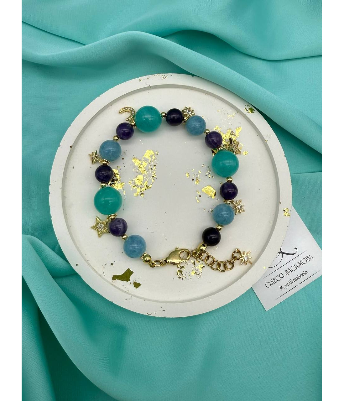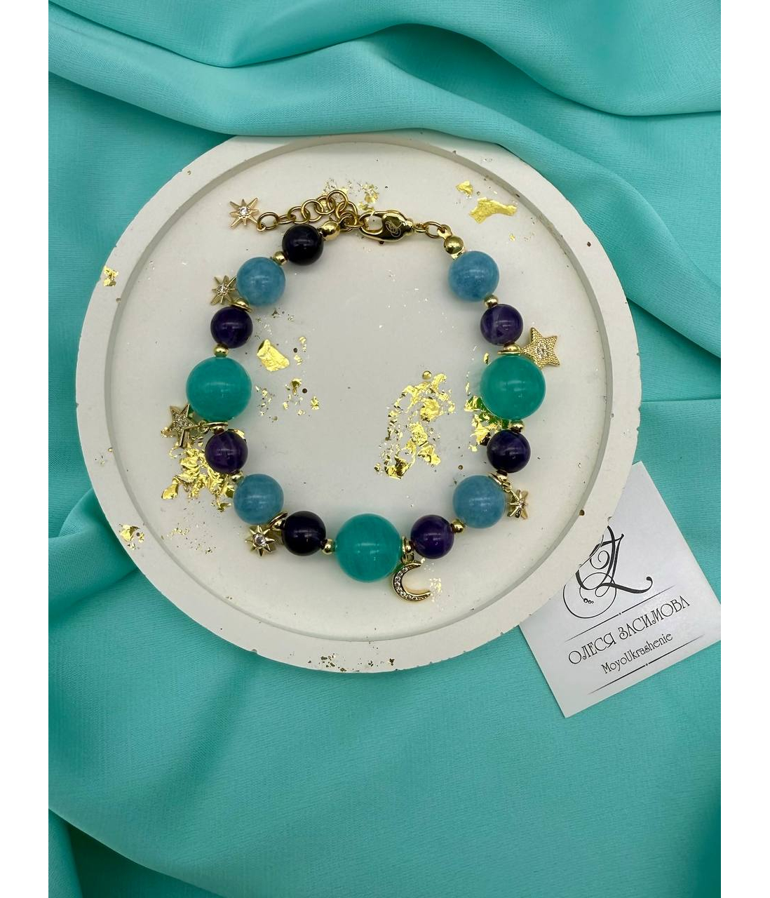 Легкий, как сон, и волшебный, как ночь. Этот браслет соединяет в себе спокойствие аквамарина, глубину аметиста и яркость амазонита. Золотистые подвески — звёзды и полумесяц — мерцают при каждом движении, словно маленькие огоньки во тьме.