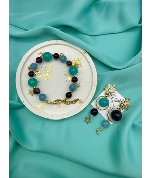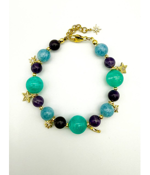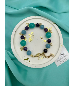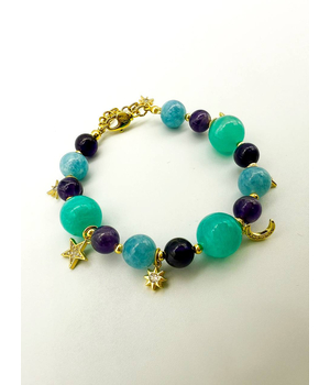 Легкий, как сон, и волшебный, как ночь. Этот браслет соединяет в себе спокойствие аквамарина, глубину аметиста и яркость амазонита. Золотистые подвески — звёзды и полумесяц — мерцают при каждом движении, словно маленькие огоньки во тьме.