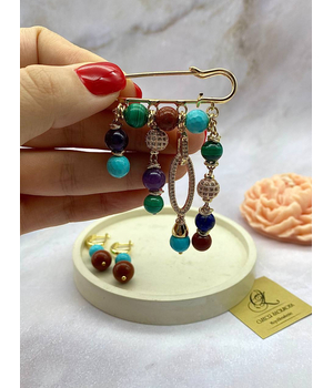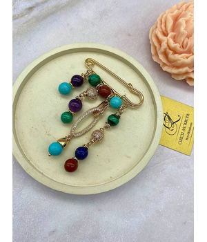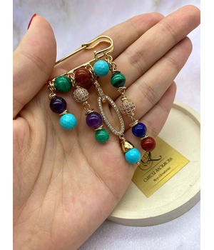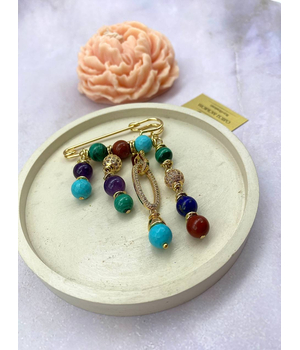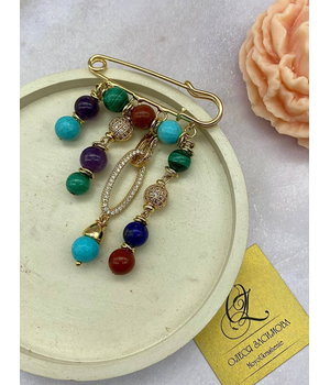 Йога-мала, брошь-булавка из аметиста, малахита, турквенита, лазурита и яшмы, позолота
