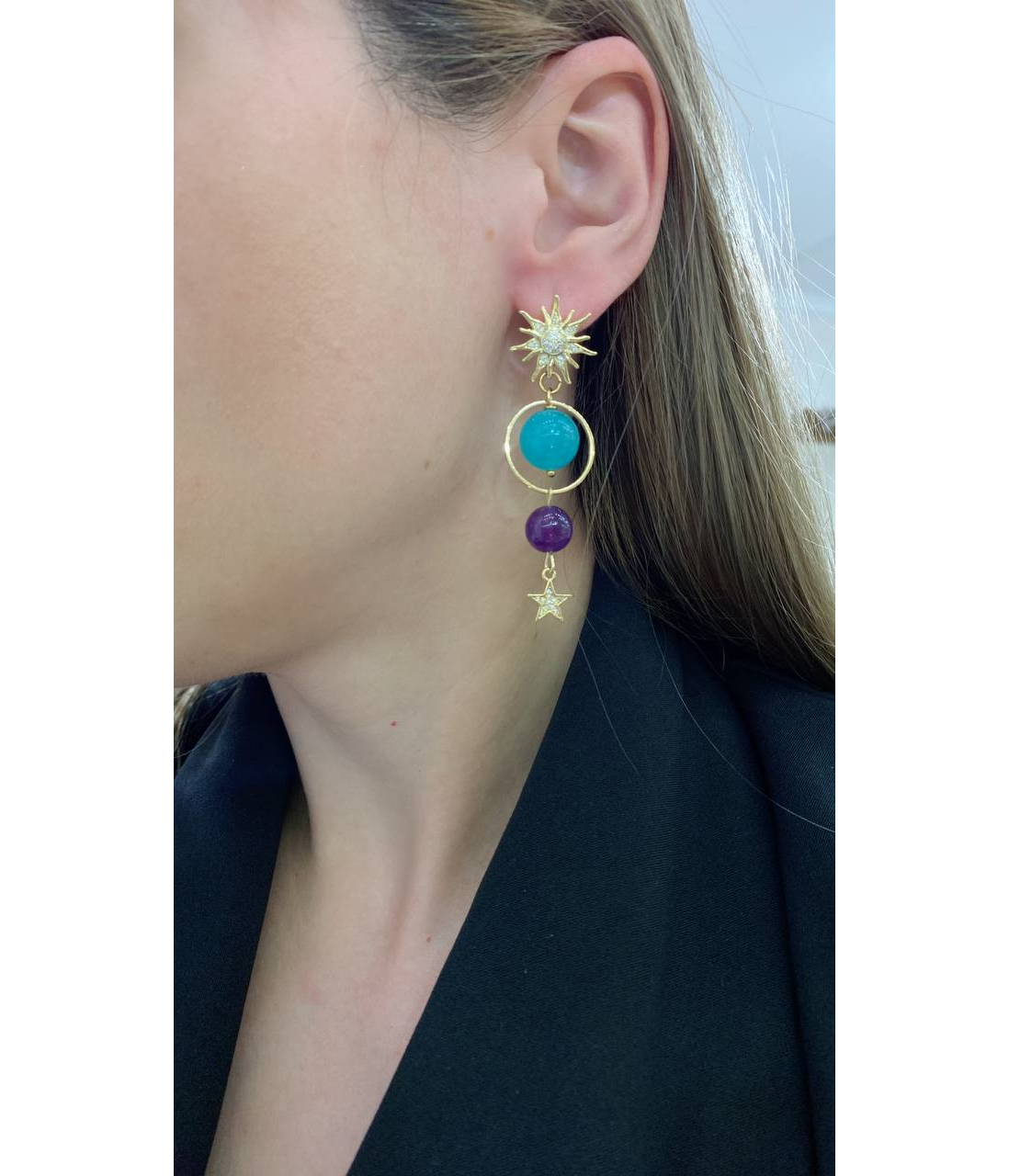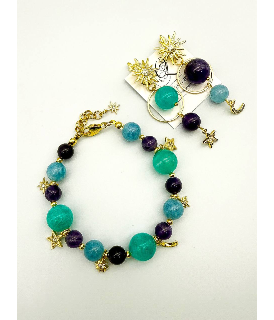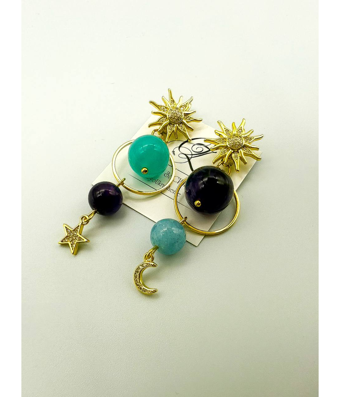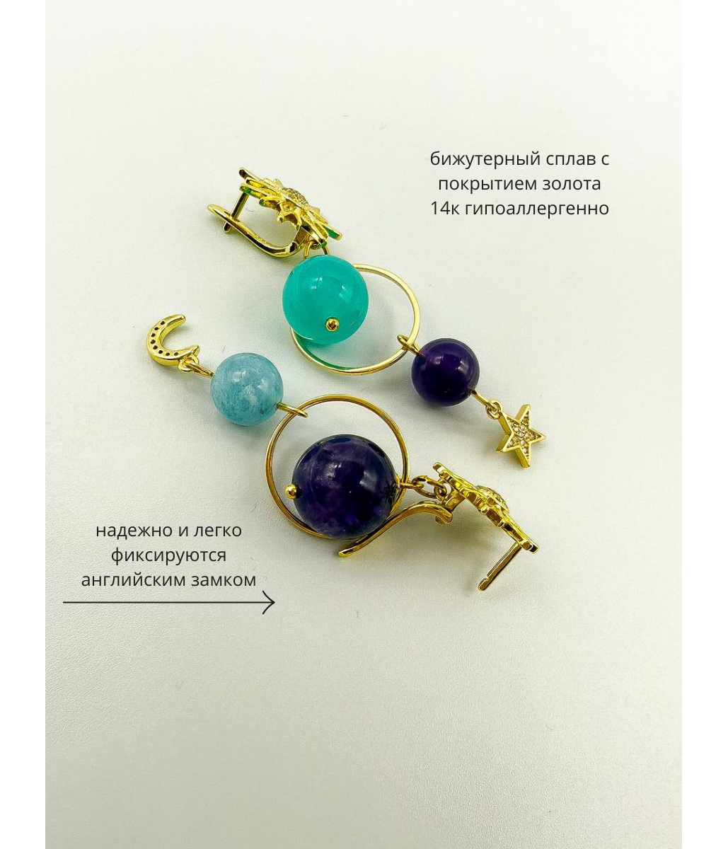 Серьги «Чудесные сны» — украшение с особой магией. Нежные оттенки амазонита, аквамарина и аметиста создают гармонию и притягивают внимание, а подвески в виде луны и звезды с фианитами добавляют сияния и загадочности. Эти серьги красиво удлиняют шею и подходят к образам в пастельных, белых и глубоких тонах. Идеальны для праздников, вечеринок и особых случаев, а также станут прекрасным подарком на Новый год, 8 марта, День матери или день рождения.